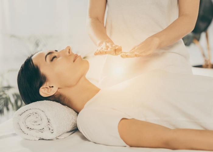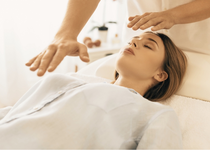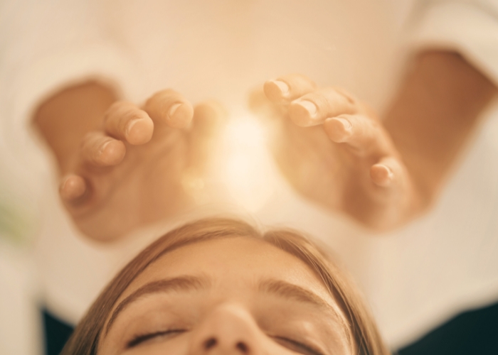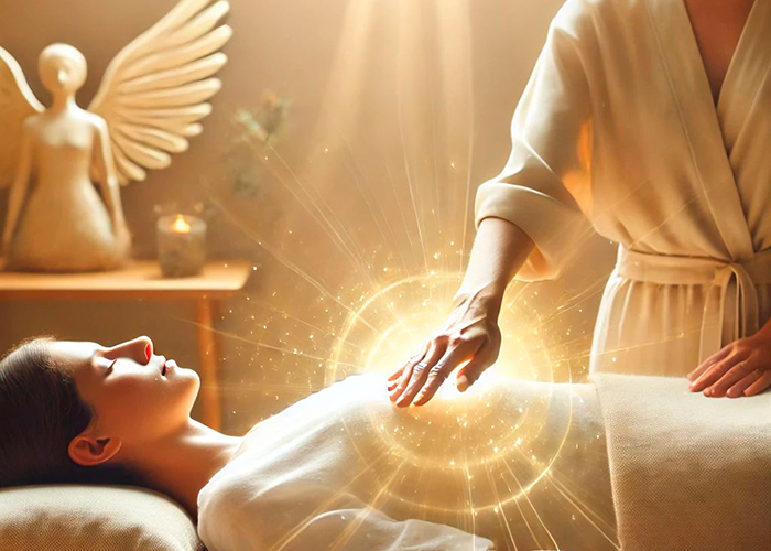 Imposição suave das mãos como canalização de energia para promover relaxamento, alívio do estresse e apoio à cura física e emocional.